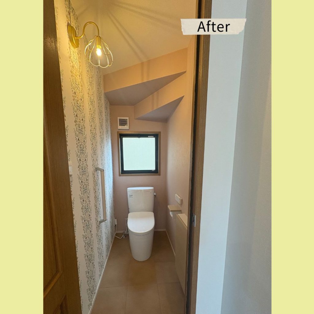 また、花柄のアクセントクロスはお花の照明との統一感もあり、おしゃれなトイレ空間に変身しました♪